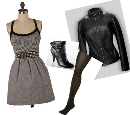 I took this dress and glammed it up with a black leather (or faux leather if you prefer) motorcycle jacket, some black tights, a pair of Nine West ankle boots, and some subtle silver jewelry for a look that is not only Rocker Chic, but just plain hot. You will be stopping cars and motorcycles alike in this outfit, and I guarantee that you will have no trouble getting a cab!