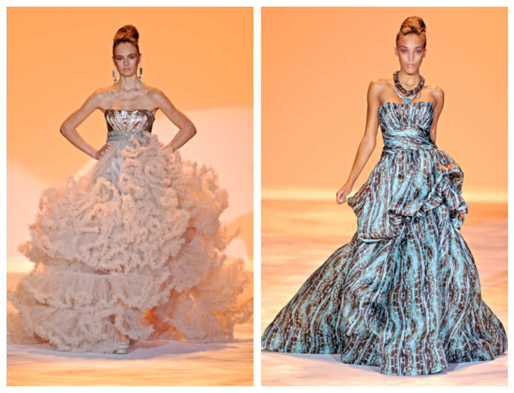 Siriano really shines when it comes to his breathtaking and unwaveringly feminine gowns. I can only imagine that when the gown on the left hit the runway, there was lots of all-around sighing and about a bazillion flashbulbs going off. I love that he paired a metallic faux-croc skin print with a soft, billowy cascade of ruffles. If I were a Disney Princess, that’s the dress I’d request. Also of mention, the fabulous print mentioned above fashioned into a full-on gown. Hello, awards season!