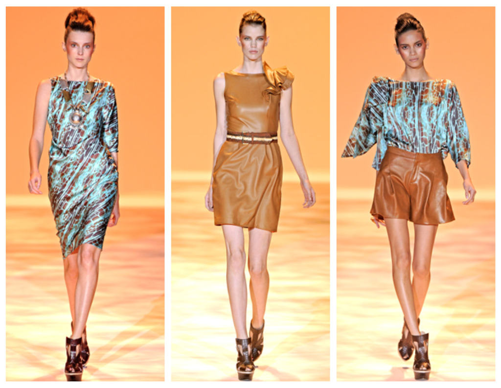 The show started with lots of white, accessorized with Siriano’s own line of shoes from Payless. The looks were strong, very conscious of the female form, and quite often very romantic (I love the tulip hemline in the middle look, above.) The collection was inspired by Africa, India, and China which was evident in the towering wooden cutout heels (and one rather suspicious brocade suit in a safari print).