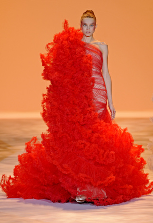 Of course, I couldn’t leave out a photo of the showpiece in all of it’s overwhelming ruffled glory. Way too much in my book, and destined to never be worn beyond the runway, but certainly dramatic and oddly satisfying.