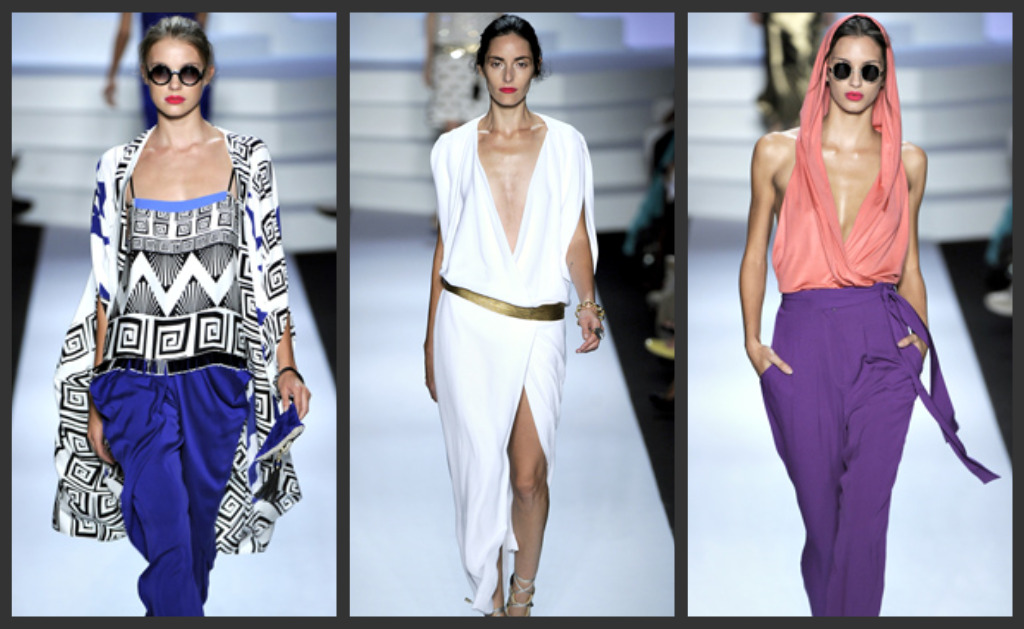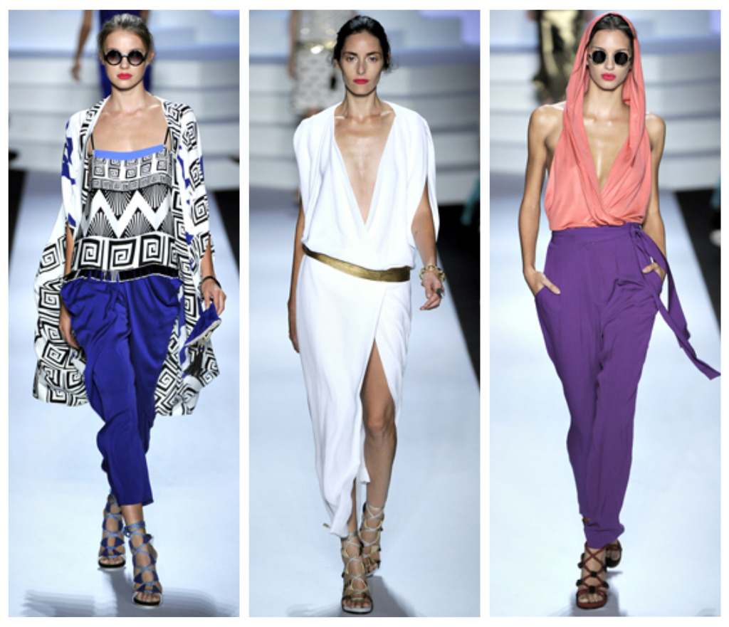 Diane’s Spring collection? Greek goddess meets Crayola, and it couldn’t have been more on the mark. The Mediterranean vibe was conveyed best by the Greek key trims on many looks, along with a number of geometric patterns on both tops and dresses. And nothing says “goddess” like soft, flowy, feminine draping. As a designer who has become a legend for creating sexy silhouettes that showcase a woman’s femininity without being over-the-top girly, DvF did not disappoint. True to the line’s aesthetic, color was ever-present: bright hues like cobalt, yellow, rich tans and coral punctuated many of the looks. In many instances, they were pulled together in surprisingly patternless ensembles and complemented with pops of sky blue and a rich plum. This departure from the look of her usual collections, blanketed with pattern was a welcome change.