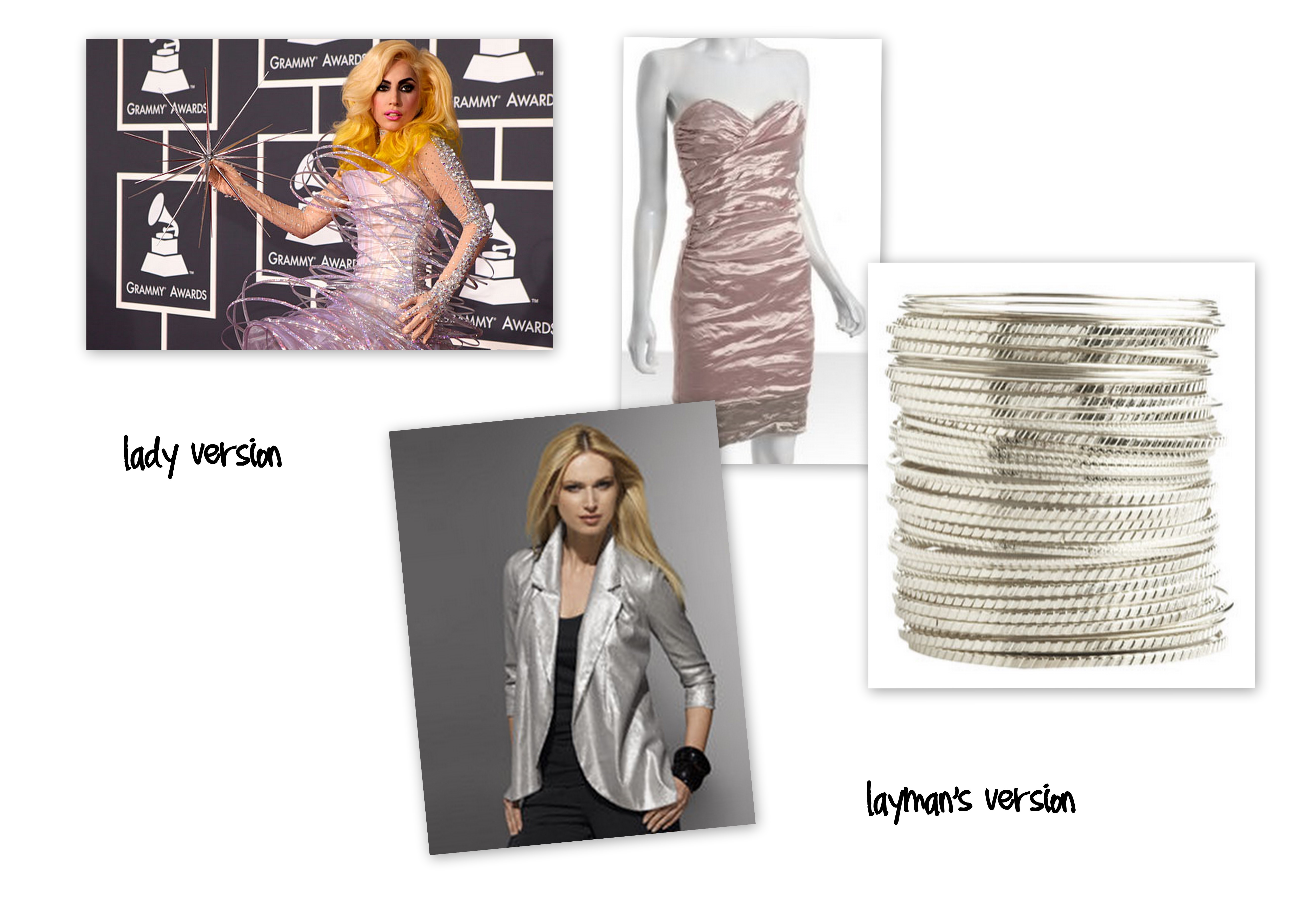 So we’re all admittedly gaga for Gaga. Sure, her outfits are outlandish and sometimes always crazy but the girl knows how to make a statement. Being one who is inspired by looks from catalogs, fashion sites and the occasional trash mag, it’s kind of fun to take her wild outfits and make them a little more wearable. Check out the looks done the Lady way and then the layman’s way…