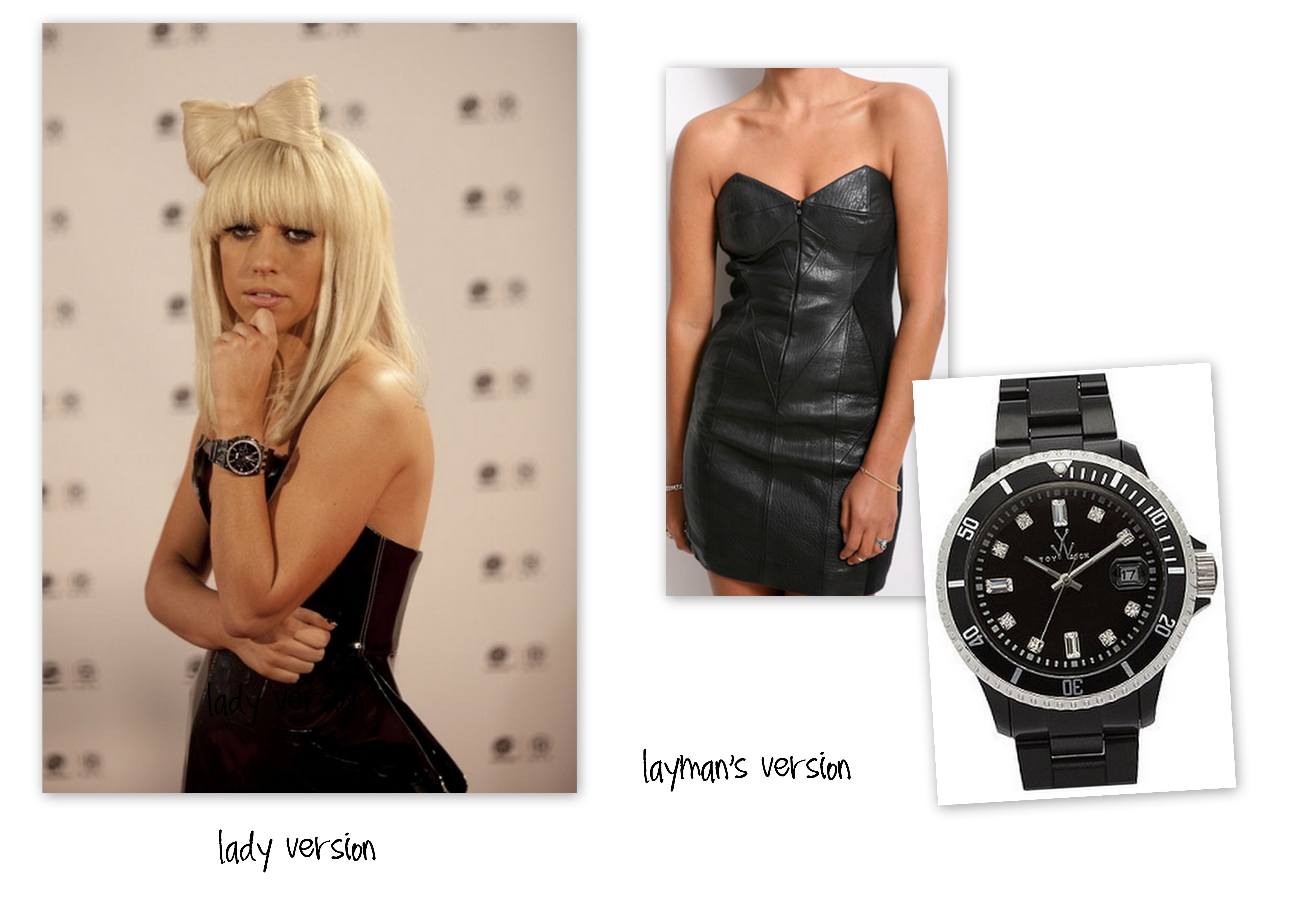 the simplest look is a sassy leather dress with a huge black watch. the (literal) hair bow is optional, but will definitely tie your look together. need some styling tips? see the video below.