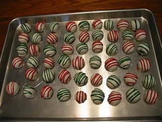 - Cut off the corner of a sandwich bag and drizzle hardened Oreo Balls with red and green almond bark.