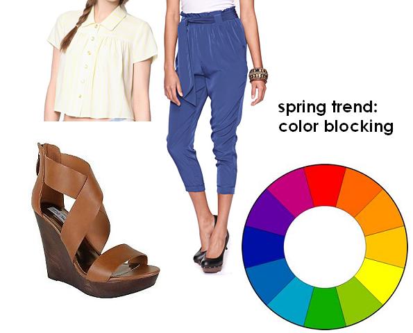 Have you dared to try colorblocking yet? It’s one of Spring’s boldest and most adventurous trends…I myself have dabbled in a very small way. Baby steps! One way to make it easier to try this look is to do it on the cheap-shop places like Forever21 and H&M for moderately priced items in bold colors. The key here is to pick two bold colors that “pop” against each other-think complementary colors (indigo and neon yellow) or colors that are fairly adjacent to each other on the color wheel (fuschia and red). If you’re feeling a bit timid about this trend, keep the silhouettes simple and easy. Anchor your look with a neutral shoe or belt- black or camel work best. Pull your outfit together, gather your confidence and get ready to start turning heads!