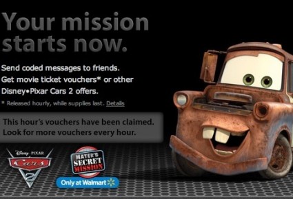 For all of you die-hard Mater fans, check out Mater’s Secret Mission which Walmart just launched on their Facebook page! Aside from it being oodles of fun to play around with, you can win movie vouchers, exclusive downloadable coloring pages, and Disney Mater’s Tall Tales Videos. If you want a chance to win, just send a coded message to a fellow “secret agent”! You can also buy exclusive Cars 2 merchandise through the Mater’s Secret Mission Facebook app – which is super cool!
