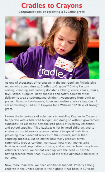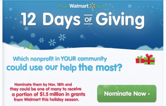 Then, on December 10, Walmart will kick off the 12 Days of Giving and announce which Facebook-nominated companies will receive funding. Last year, organizations like Cradles to Crayons received as much as 20,000 each to fund new and on-going programs.